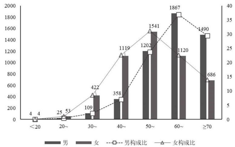 摘要:目的回顾性分析某三级甲等医院2018-2023年恶性肿瘤住院患者病历资料,探讨疾病构成、变化趋势及人口统计学特征,为本地区恶性肿瘤防治策略制定提供依据。方法收集某院2018-2023年HIS 系统病案首页数据,统计肿瘤患者的性别、年龄、癌种等的分布情况。结果共纳入10000例恶性肿瘤患者,其中男女比例为1.02:1。恶性肿瘤患者主要为50岁以上人群,60\~70 岁及70岁以上高龄男性患者多于女性,其余年龄组女性占比较高,且乳腺癌患者人数居首位。随年龄增长,乳腺癌、肺癌等发病率存在一定变化。不同血糖情况的乳腺癌患者在合并高血压、组织学分级等方面比较,差异有统计学意义( P<0.05) ,各组内ER 阴性患者多呈现不良病理特征。结论 该地区中老年为恶性肿瘤高发人群,不同性别、年龄肿瘤发病各有特点,糖尿病患者中乳腺癌发病率可能较高且预后差,建议对乳腺癌患者常规行OGTT检测,以改善治疗与预后。
