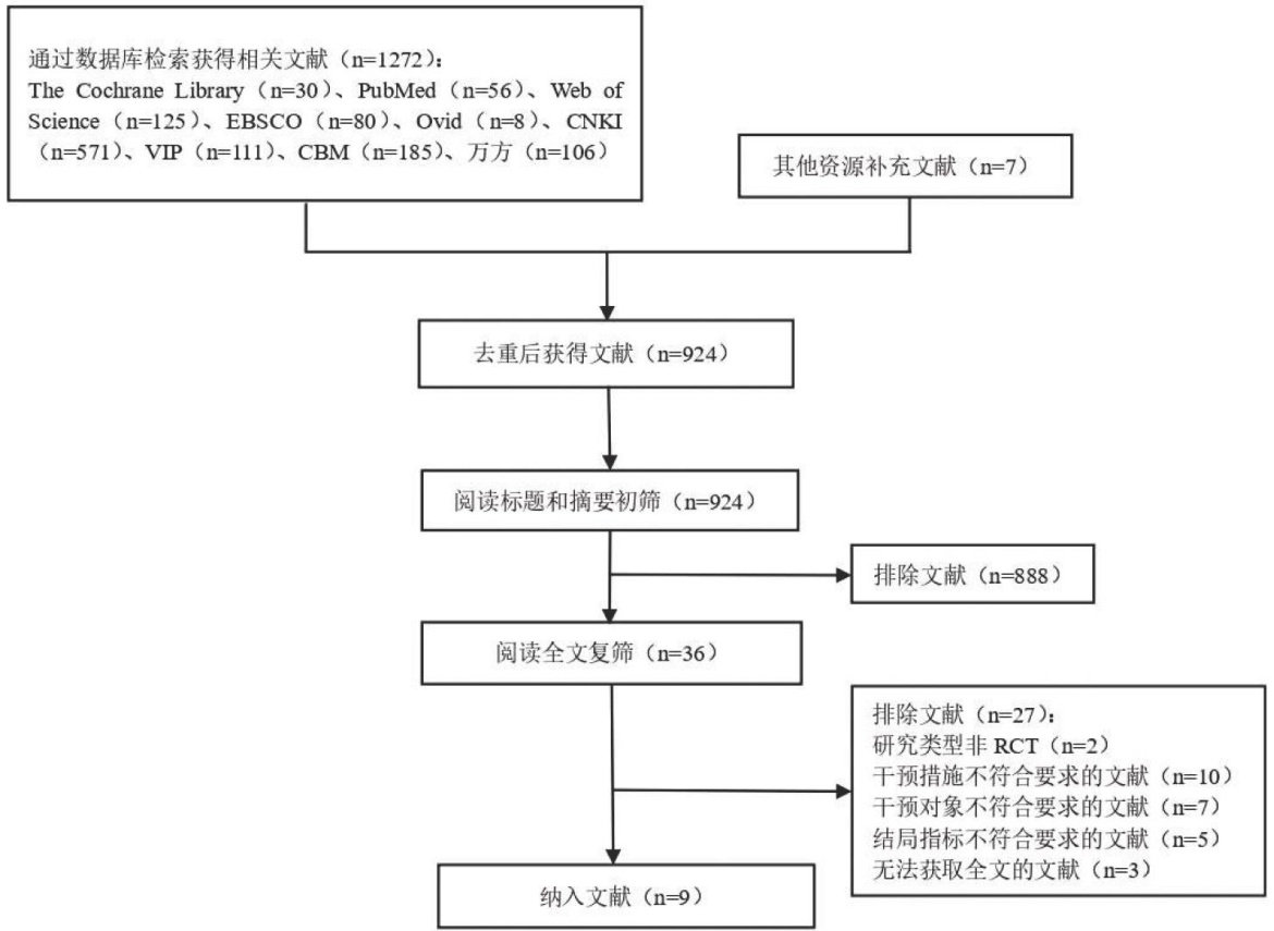 摘要:目的评价多种非药物干预类型对改善失能老人负性情绪的干预效果。方法系统检索中国知网、维普、万方医学数据库、中国生物医学文献数据库、PubMed、Web of Science、The Cochrane Library、EBSCO、Embase、Medine、Ovid、CINAHL等数据库中关于非药物干预对改善失能老人负性情绪的随机对照试验研究。检索时限为建库至2024年10月,由2名研究者独立进行文献筛选及数据提取,并采用Cochrane手册5.1.0版随机对照试验偏倚风险评估量表对纳入的文献进行质量评价,使用RevMan5.3软件进行Meta分析。结果共纳入9篇文献,共计730例失能老人,Meta分析结果显示,非药物干预能够改善失能老人的焦虑情绪 [SMD=-1.34,95%CI(-1.70,-0.97),P<0.01]?. 抑郁情绪[SMD=-0.83,95%CI(-1.15,-0.51), P<0.01] 和孤独情绪 [MDmathsf=-8.71 ,95%CI(-15.06,-2.37),P<0.01] 。结论认知行为治疗、情感艺术治疗、身体机能治疗、触摸治疗能够改善失能老人的负性情绪。每日进行1次联合干预,选择触摸 +? 理疗法、运动 + 认知行为疗法、人生回顾 + 音乐疗法中的任意一种,且每次干预的时间控制在 30min 以内,持续干预12周的方案对改善失能老人抑郁情绪的效果更好。