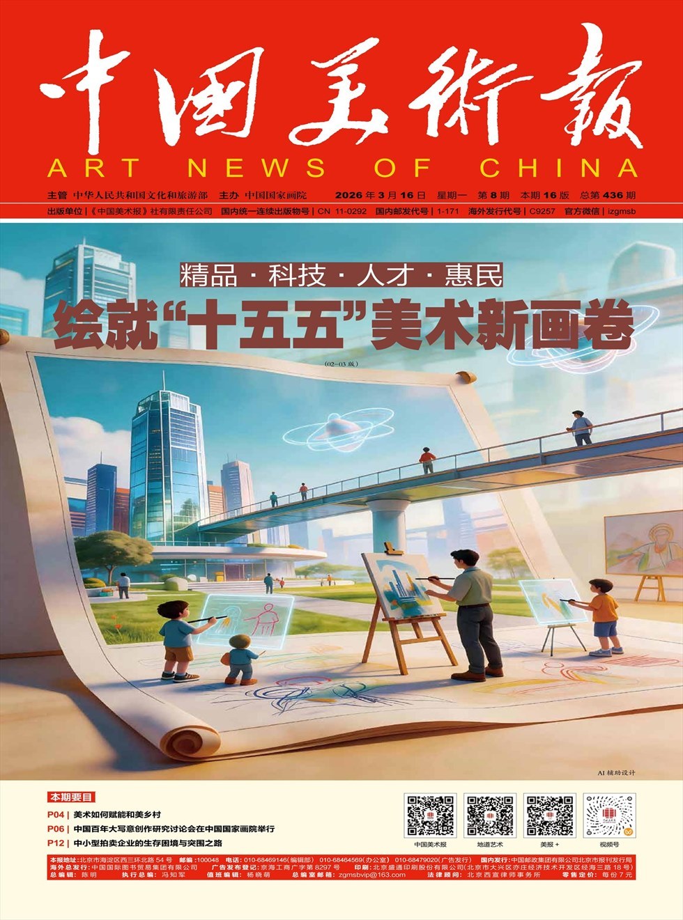 《中国美术报》成立于2015年12月26日,是文化和旅游部主管、中国国家画院主办的国家级美术专业媒体。2015年1月,由国家新闻出版广电总局批准创办,2016年1月正式出版。报纸的国内统一连续出版物号为CN11--0292,国内邮发代号为1-171,海外发行代号为C9257,篇幅为4开20版,彩色胶印周报,逢周一出版。