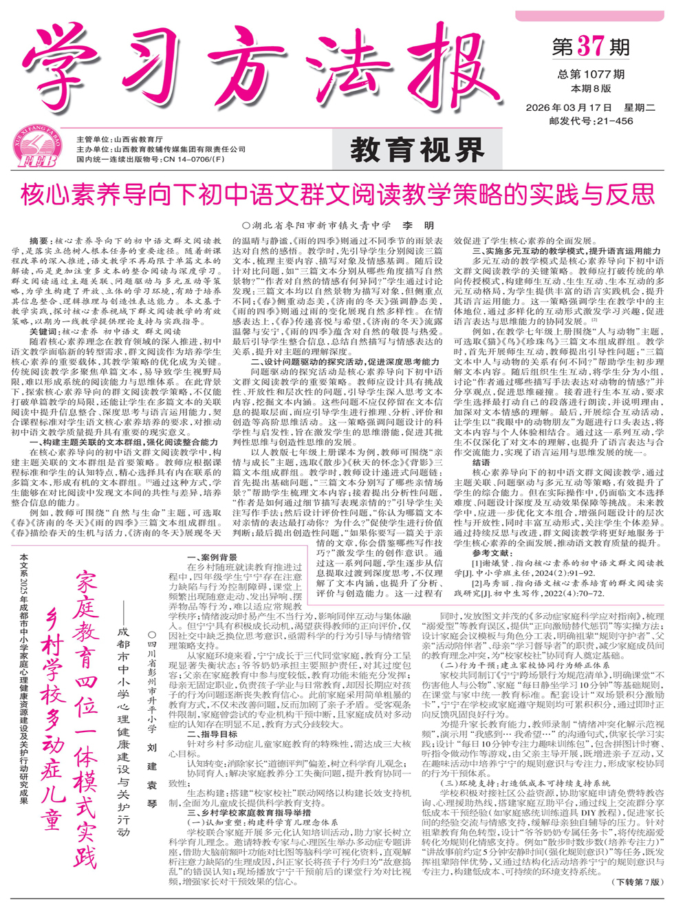 封面文章 | 核心素养导向下初中语文群文阅读教学策略的实践与反思