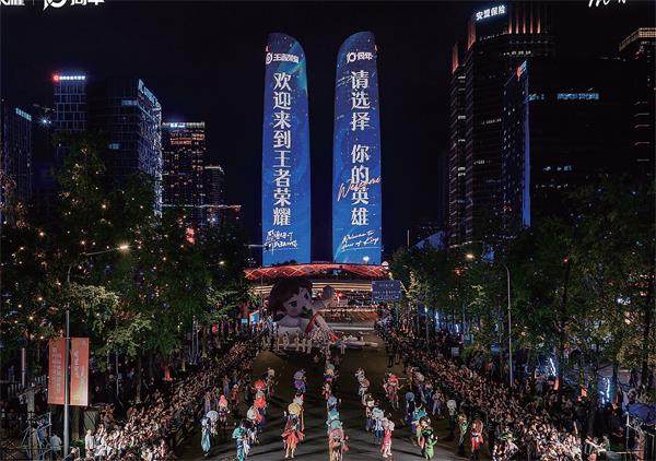 2025年9月,2025数字文创季暨王者荣耀十周年城市嘉年华-双子塔 2025年10月26日晚,成都地标——高新区双子塔的数字幕墙上,反复打出“王者荣耀十周年”的字样,闪耀全城。 城市另一侧,《王者荣耀》十周年“共创之夜”晚会在凤凰山体育公园举办,国风舞台、数字光影与数万名粉丝的欢呼声将这个巨型场馆彻底“点燃”。 许多玩家可能没有意识到的是,《王者荣耀》2015年诞生于成都,其研发团队天美L