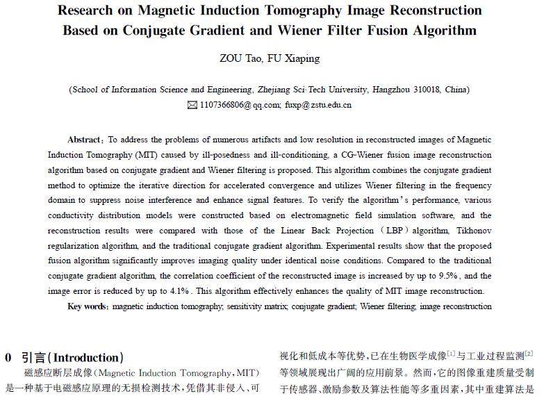 摘 要:针对磁感应断层成像(MIT)因病态性和不适定性导致的重建图像伪影多、分辨率低的问题,提出一种基于共轭梯度算法与维纳滤波相结合的CG-Wiener融合图像重建算法。该算法结合共轭梯度法优化迭代方向以加速收敛,并利用维纳滤波在频域中抑制噪声干扰、增强信号特征。为验证算法性能,基于电磁场仿真软件构建多种电导率分布模型,并与线性反投影(LBP)算法、Tikhonov正则化算法以及传统共轭梯度算法的