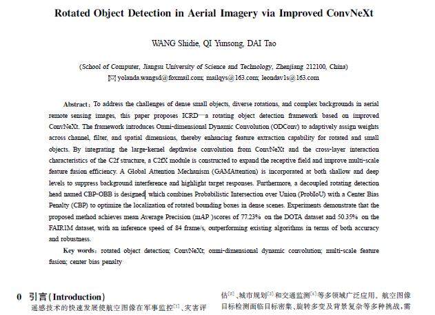 摘 要:针对航空遥感图像中小目标密集、旋转多变及背景复杂等问题,提出了一种基于改进ConvNeXt的旋转目标检测框架ICRD。使用全维动态卷积(ODConv)在通道、滤波器与空间3个维度自适应分配权重,增强对旋转目标和小目标的特征捕获能力。结合ConvNeXt的大核深度卷积与C2f结构的跨层交互特性构建C2fX模块,以扩展感受野并提升多尺度特征融合效率。在浅层与深层引入全局注意力机制(GAMAtt