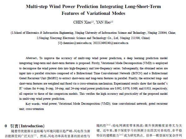 摘 要:为提高风电功率多步预测精度,提出了一种融合长期与短期特征的深度学习预测模型。首先,采用变分模态分解(VMD)将风电功率数据分解为高频和低频序列;随后,将得到的序列输入双向时间卷积网络(BiTCN)和双向门控循环单元(BiGRU)组成的并联结构中,并行提取短期和长期特征;最后,通过交叉注意力机制加权融合提取到长短期特征。实验结果表明,模型在风电功率的4步、8步、16步和24步预测中的R2 分
