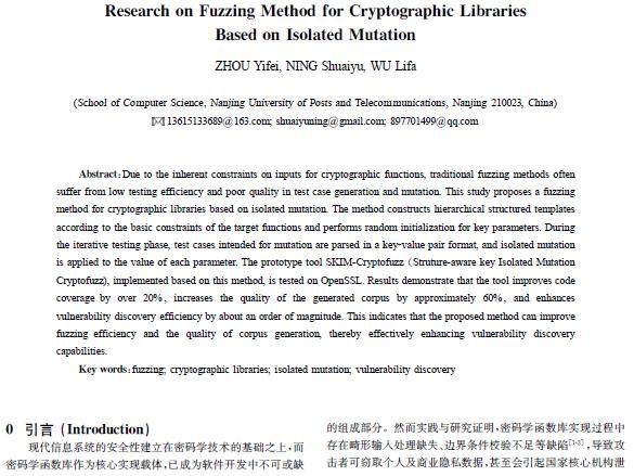 摘 要:由于密码学函数对输入存在一定约束,传统模糊测试存在测试效率低、测试用例生成及变异质量不佳的问题。提出了一种基于隔离式变异的密码学函数库模糊测试方法,根据目标函数基本约束构建分层结构化模板,并对关键参数进行随机初始化。在迭代测试阶段,将用于变异的测试用例以键值对形式解析,并针对各参数的值进行隔离变异。基于该方法实现的SKIM-Cryptofuzz原型工具在OpenSSL上测试的结果表明,该工