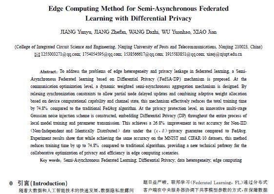 摘 要:为了解决联邦学习中的边缘异构性和隐私泄露的问题,提出了一种基于差分隐私的半异步联邦学习(FedSA-DP)机制。在通信优化层面,设计动态加权半异步聚合机制,通过松弛同步约束允许部分节点延迟更新,结合设备计算能力与信道状态的自适应权重分配,比传统FedAvg算法有效缩短整体训练时间74.8%。在隐私保护层面,创新性地构建多阶段高斯噪声注入方案,将差分隐私(DP)嵌入本地模型训练与参数传输全过