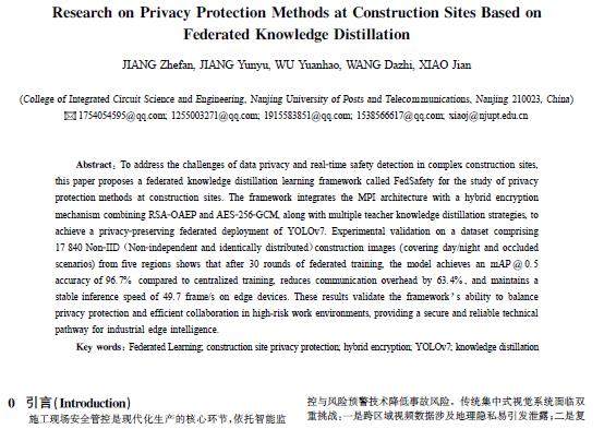 摘 要:针对复杂施工现场的数据隐私和实时安全检测问题,提出了一种针对施工现场隐私保护方法研究的联邦知识蒸馏学习框架FedSafety,集成MPI架构与RSA-OAEP/AES-256-GCM混合加密机制,结合多种教师知识蒸馏策略,实现隐私保护的YOLOv7联邦化部署。在包含17840张非独立同分布(Non-IID)施工图像(涵盖昼夜/遮挡场景)的5个区域数据集上验证表明:经30轮联邦训练后,模型准