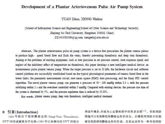 摘 要:足底动静脉脉冲气泵系统是可加压于足底静脉丛,产生高速血流,对静脉进行冲刷,防止血栓形成,预防深静脉血栓形成的装置。针对现有设备存在的气压控制精度不足、响应速度慢以及未考虑温度对血栓形成的抑制作用等问题,开发了一种新型瞬时脉冲足底静脉泵的智慧医疗设备。当目标压力设定为10kPa时,根据下肢静脉血流的典型生理参数、气压测量电路、均方根(RMS)数据处理以及模糊PID控制算法,成功搭建了硬件电路
