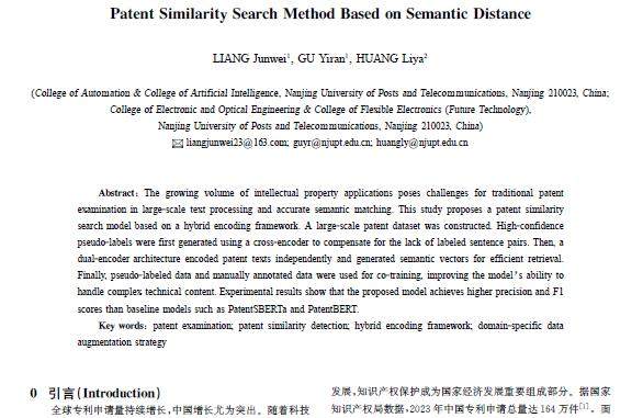 摘 要:随着知识产权申请需求不断攀升,传统专利审查方法在海量文本处理与精确语义匹配方面面临着挑战。现有的基于深度学习的专利相似性检索方法存在信息量多、复杂语义匹配不精确的问题。构建了大规模专利数据集,提出了一种基于混合编码架构的专利相似性分析模型。首先,模型通过交叉编码器生成高置信度的伪标签,弥补了专利标注句子对数据的不足;其次,采用双编码器架构对文本进行并行化独立编码,并生成语义向量,以实现高效