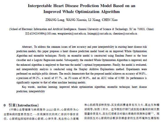 摘 要:针对现有的心脏病风险预测模型普遍存在准确率低和可解释性差的问题,提出了一种基于改进鲸鱼优化算法和集成技术的心脏病预测模型。首先,以随机森林为基础分类器与逻辑回归模型进行集成;其次,改进鲸鱼优化算法,使用改进后的算法调整模型的最优超参数;最后,评估模型并使用沙普利加性解释方法进行可解释性分析。使用多个公开数据集进行实验,结果表明该模型达到了96.8%的准确率,精确率为96.2%,召回率为97