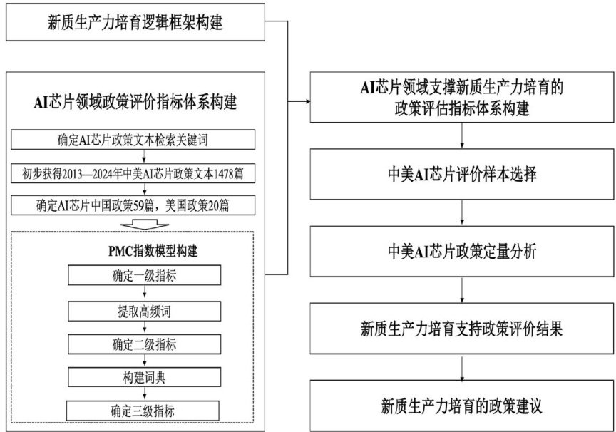 摘要:[研究目的]政策是培育新质生产力的激励工具和有效保障,分析AI芯片领域中美政策对新质生产力的支持现状,进而明晰未来发力点,是制定有效激发新质生产力政策的当务之急。[研究方法]在对新质生产力内涵深度解读的基础上,构建新质生产力培育逻辑框架体系。以此为基础,利用政策建模一致性(PolicyModelingConsistency,PMC)指数模型,采用文本挖掘法分析了79篇中美AI芯片政策,构建了包含45个三级指标的AI芯片领域新质生产力政策评价指标体系。以8篇中美AI芯片政策为样本,测度了中美AI芯片政策对新质生产力的支持情况,并进行了对比分析。[研究结论]新质生产力培育逻辑框架为深入研究新质生产力提供了理论基础,从技术创新突破、新质生产力培育、产业迭代升级和生产要素创新配置优化四个维度构建的AI芯片政策评价指标体系为政策量化分析提供了系统化方法支持。研究发现,中美政策对技术创新突破和产业迭代升级支持力度相仿,而中国政策对生产要素创新配置与优化支持力度更高,美国政策在科技成果转化资金支持上力度更大。未来,我国应构建具有开放性、系统性、动态性的政策体系,为培育AI芯片领域新质生产力提供长期有效保障,为提升中国AI芯片领域国际竞争力提供有力支持。