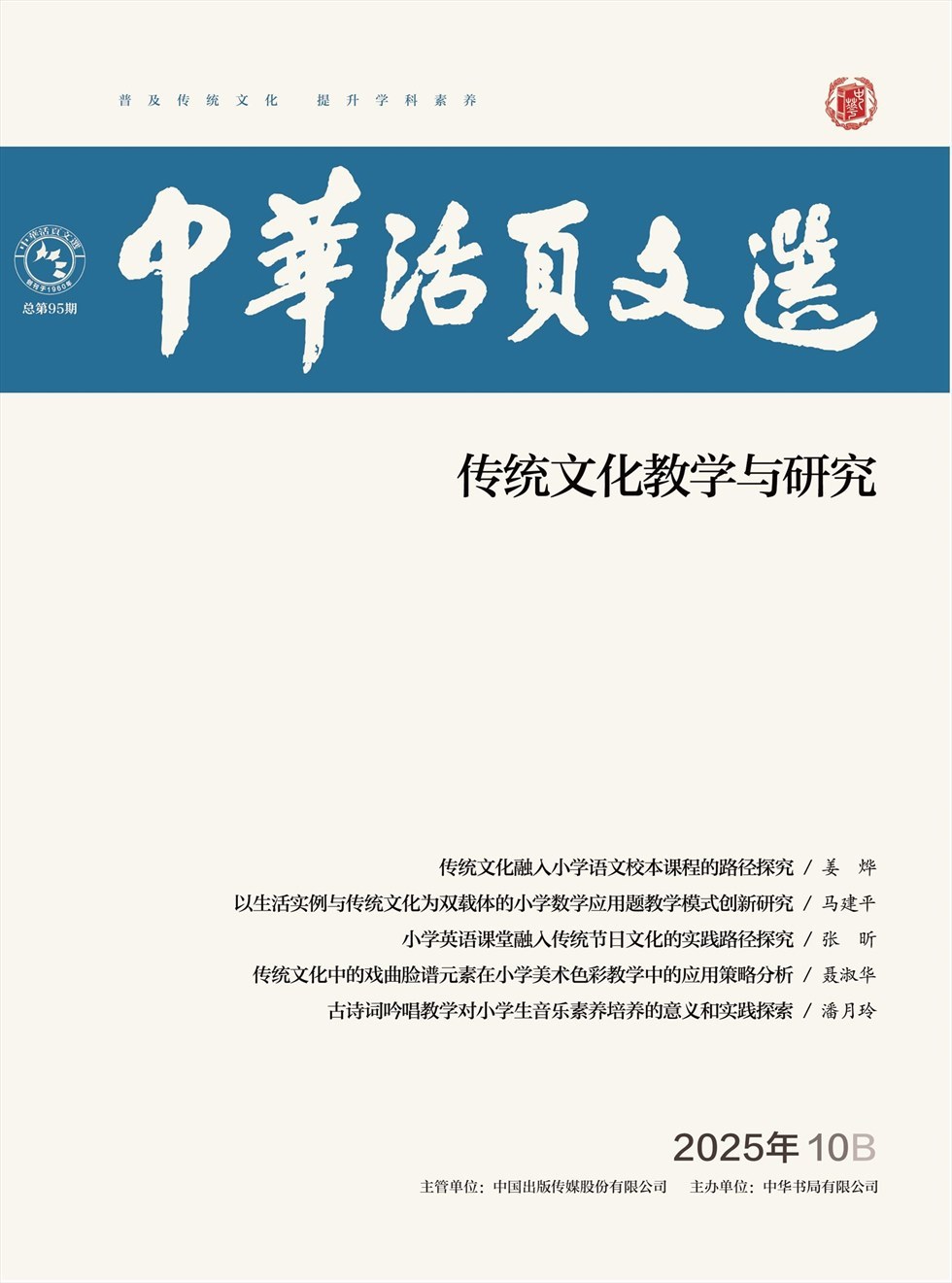 "中华活页文选(传统文化教学与研究)由中宣部中国出版传媒股份有限公司主管,百年历史的中华书局主办,面向全国发行以中华传统文化为特色的阅读教辅类月刊。 坚持正确的舆论导向和办刊方向,传播和弘扬中华优秀传统文化,提升中小学教师传统文化素养,为广大中小学教师搭建传统文化教学和语文教学的交流平台。"