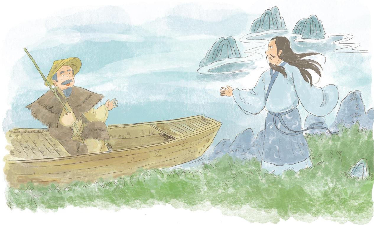 我是一个渔夫,名字这不重要。我曾在楚国的宫廷里这也不重要。重要的是,我今天见到了一位很重要的人,我们楚国最有名的大夫—屈原。 暮春的汨罗江笼罩在细密雨帘中,我坐在破旧的渔船船头闲钓一江涟漪。雨滴顺着我的斗笠滴下,滴落在蓑衣上,无声无息。岸边忽然传来一阵拨动草木之声,打破了天地间的静谧。我抬眼望去,只见一位书生打扮的中年男人正在江边踟蹰。他拨开岸边丛生的菖蒲,俯身掬起一捧浑浊的江水,凝视掌心中自己