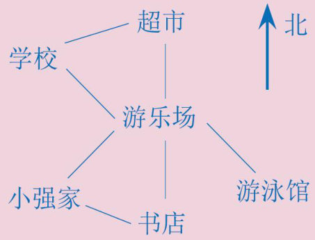 小朋友,在遇到位置与方向的相关问题时,首先要找到图中的方向标,确定图是否根据上北下南,左西右东画的,然后再根据要求回答问题。我们一起看看下面的问题吧! 例题1仔细观察图1回答下列问题 (1)超市在游乐场的( )面,游乐场的南面是( )。 (2)小强家在游乐场的( )方向,游泳馆在游乐场的( )方向。 图1 (3)小强从家先往( )方向走到游乐场,再往( )方向走就到学校了。 观察图