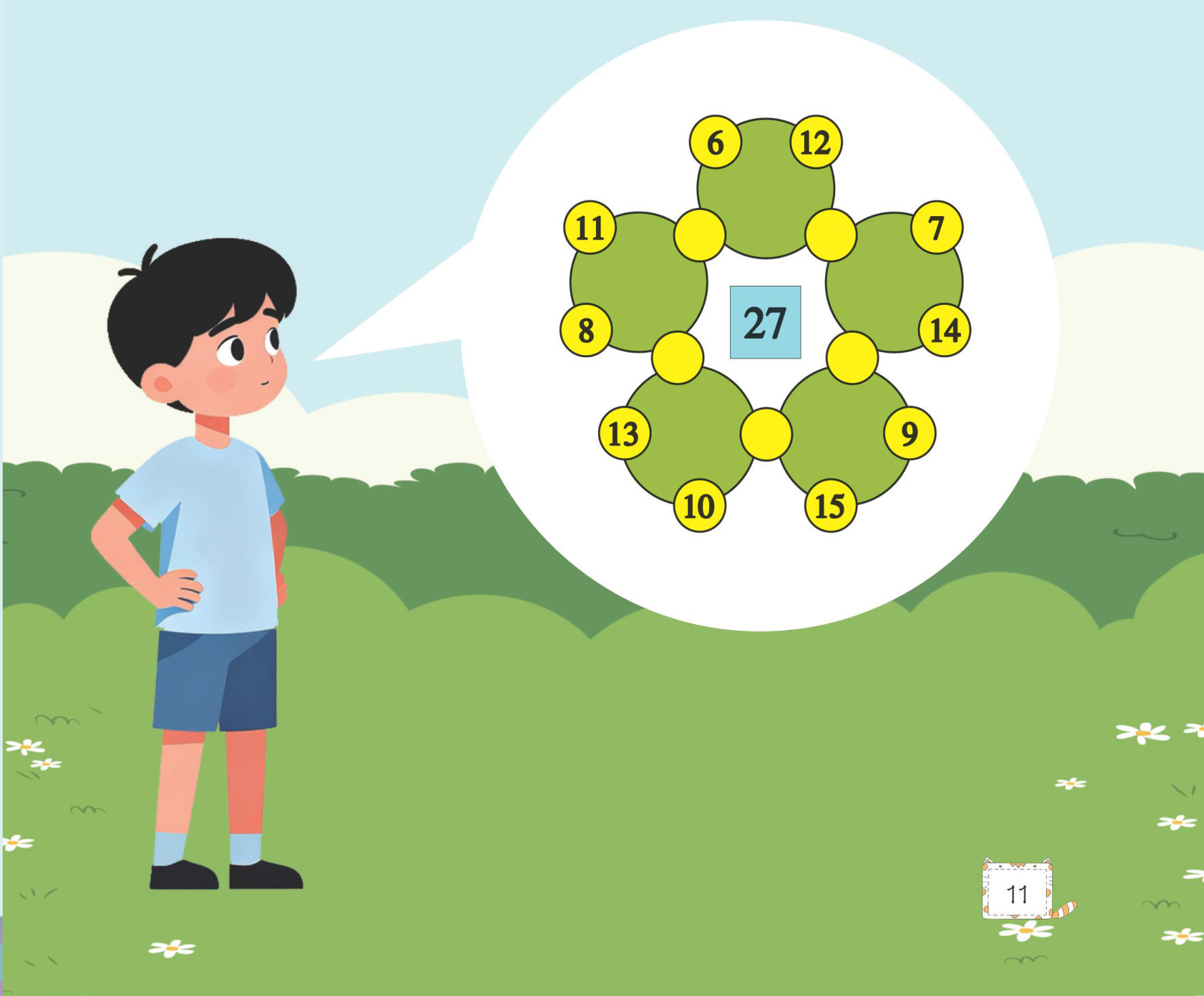 小朋友,你能将1,2,3,4,5填入下面的圆圈内,使每个圆上的四个数之和都是27吗?赶快动笔试一试吧!